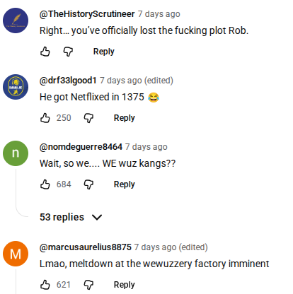There is an unacceptable spelling mistake from a native speaker of English (‘indiginous’ – indigenous) on the video’s cover photo which ironically (in an American take on the word) ties perfectly well with the sort of ‘tone’ and level of intellect possessed by the most enthusiastic and eager viewers. I shall share some of the comments from this video of purposefully Afro-rage-baiting, fallacious nonsense: