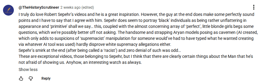 Here is another of his recent videos. This one is just pure Neo-Nazism and interestingly he features a video of one of his critiques who featured on a Joe Rogan podcast and correctly called Mr. Sepehr out for being clearly an Aryan supremacist.