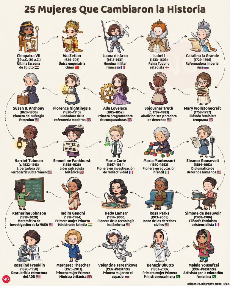 Aquí les comparto una curiosa e interesante ‘tabla’ que fue subida en las redes por una amiga cercana mía. Lamentablemente, la historia es un tema bastante dominado por los hombres y es rara la vez que se habla de la contribución femenina. Entonces, por favor revisen la tabla compartida abajo y seguramente aprenderán aunque sea solo un nombre nuevo de alguna mujer importante de la historia. Disfruten y si el artículo termina recibiendo interés y apoyo, me comprometo a subir más artículos en el idioma español. Att. The History Scrutineer.